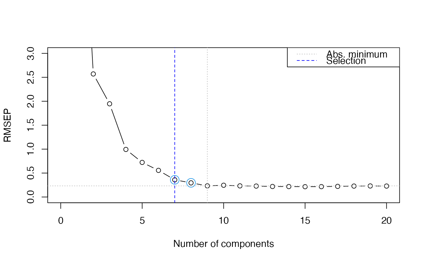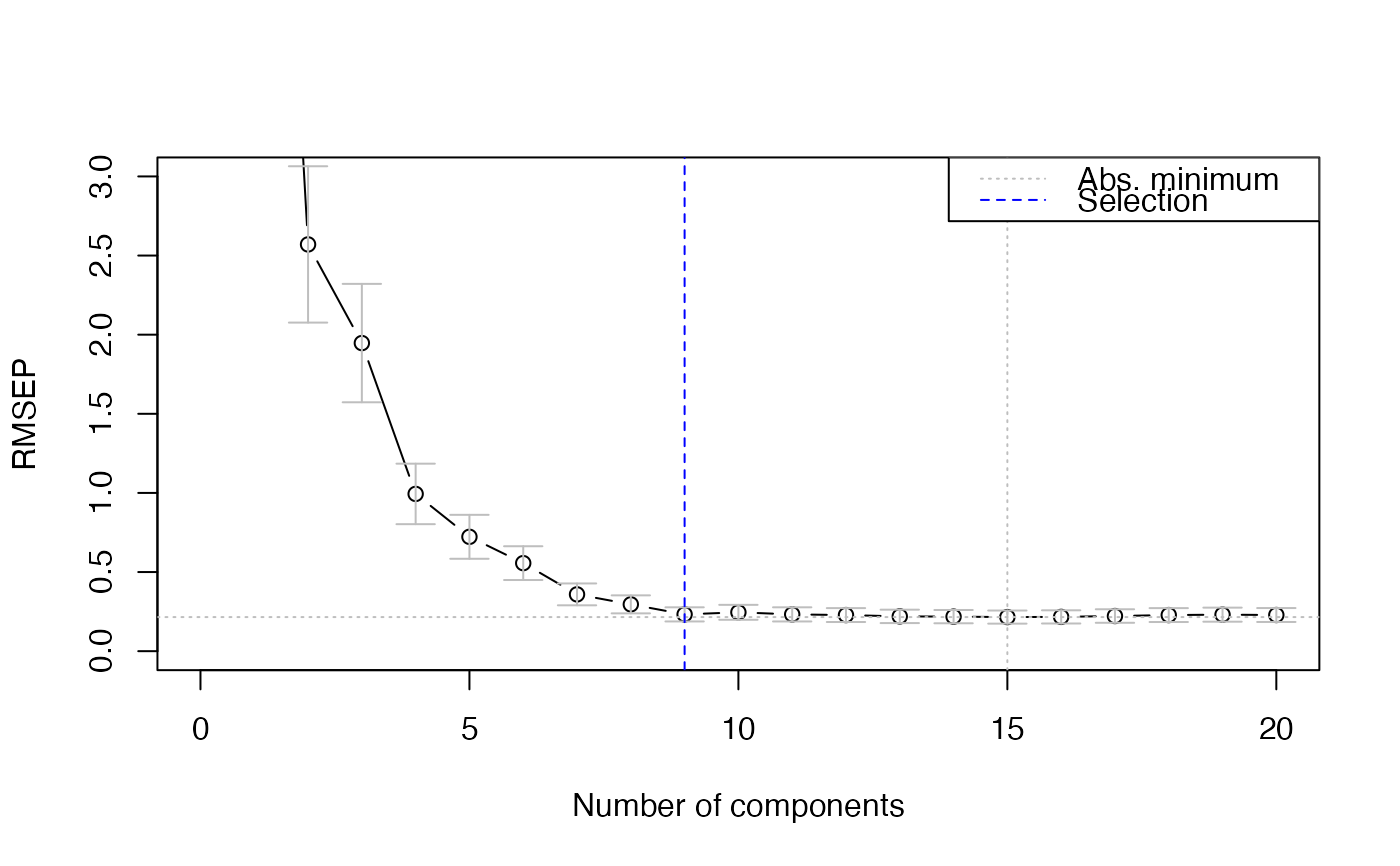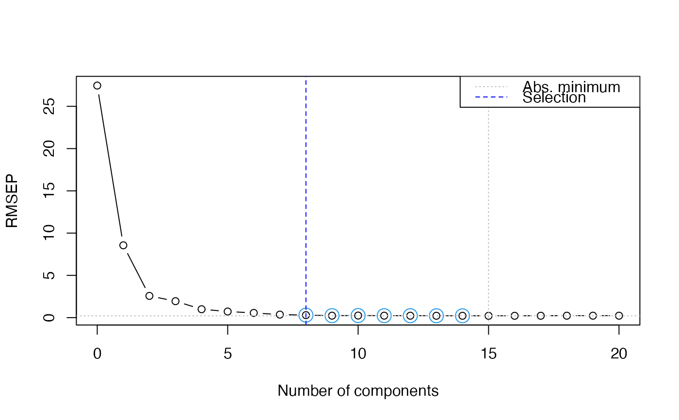 "randomization"approach shows models that do not differ significantly from the global RMSEP minimum with open circles; the"onesigma"approach shows the one-sigma bands around the RMSEP values. In both cases, the selection is indicated with a blue dashed line.- ...